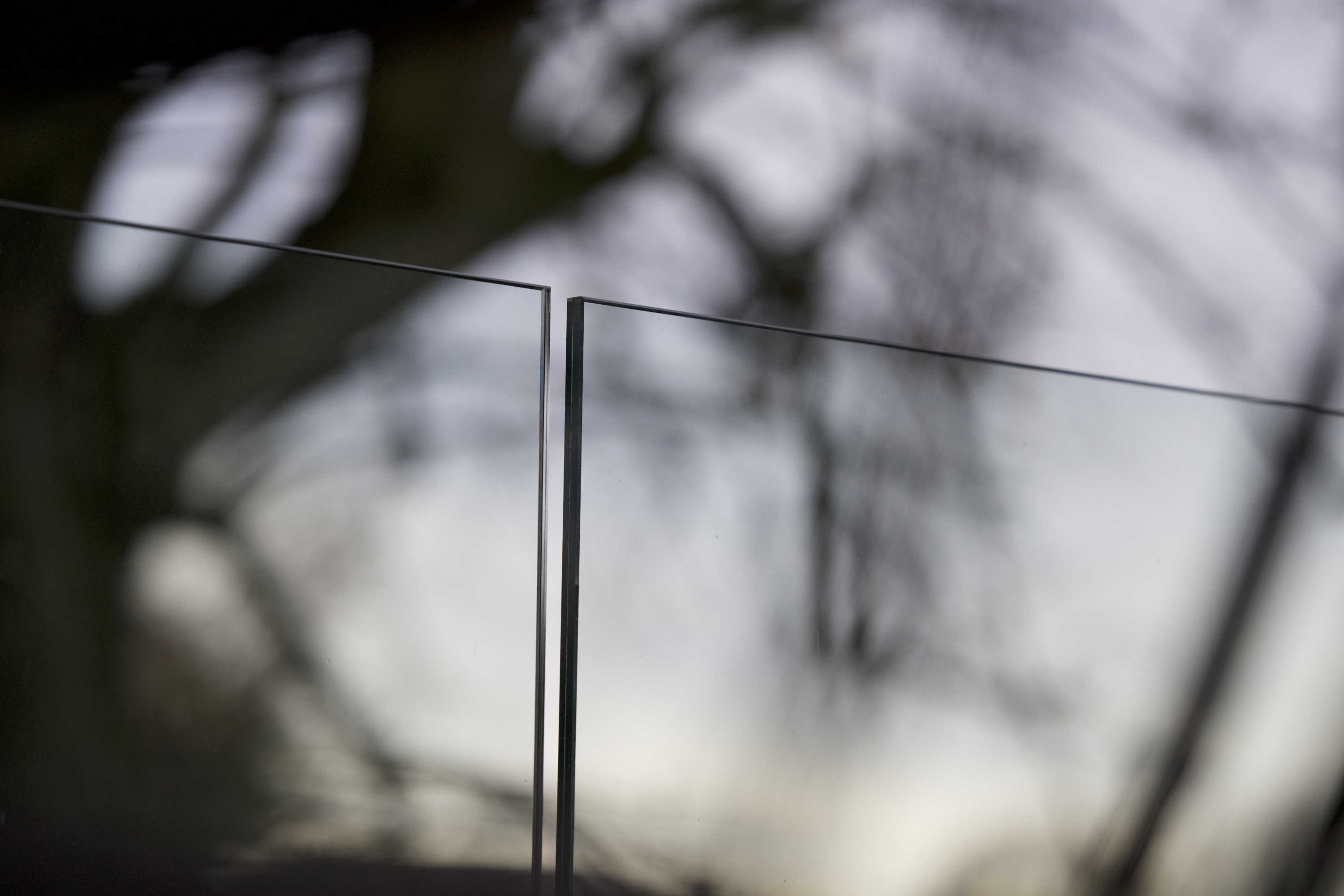 Le verre s'encastre dans le sol. Profil totalement invisible — rendu pur, ligne épurée.